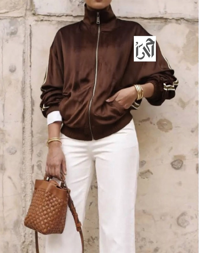 ست بامبر و شلوار مخمل قهوه ای با نواردوزی سبز انتخابی ایدهآل برای کسانی است که بهدنبال ترکیب راحتی و استایل خاص هستند.